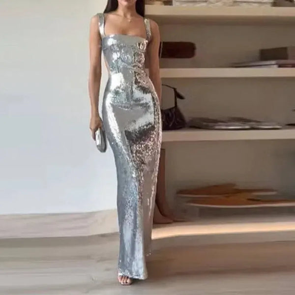 Слинг с блестками Квадратный воротник Без спинки Платье Юбка