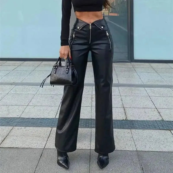 Высокая талия прямые свободные широкие ноги повседневные брюки кожа