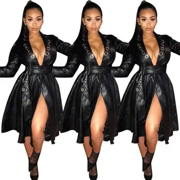 - Дополнительные детали: Имеет высокий разрез, двубортный акцент на пуговицах и пояс на талии .