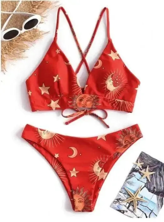 Раздельное бикини с принтом "Солнце-Луна-Звезда" с высокой талией
