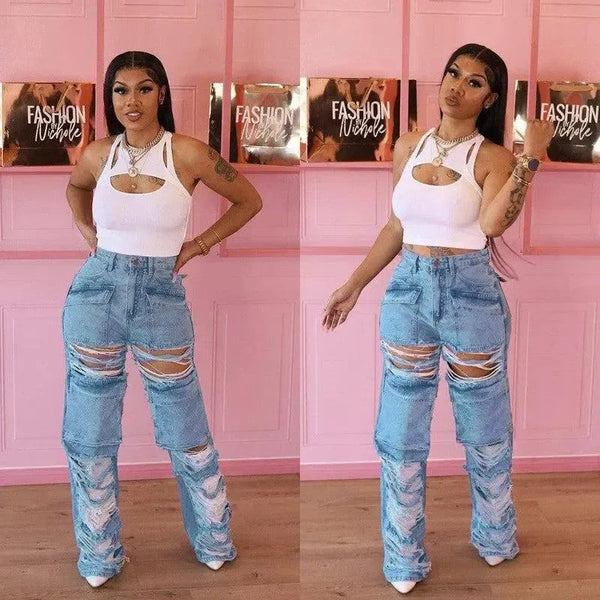 - Стиль: Женские прямые рваные джинсы с высокой талией на молнии .