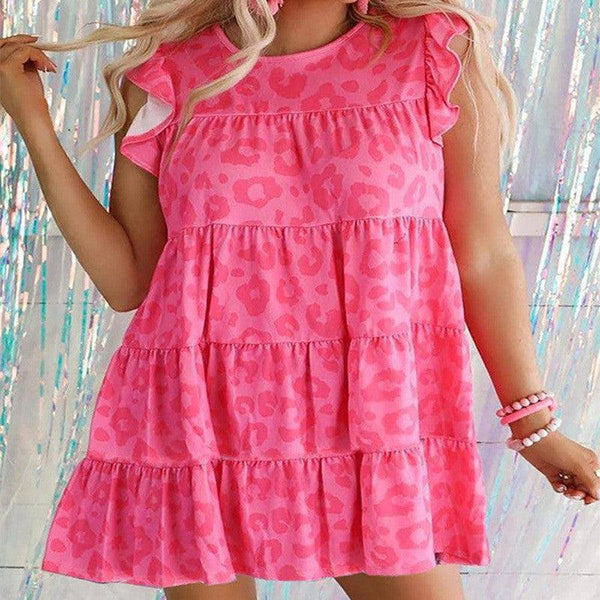 Летнее мини-платье с леопардовым принтом и круглым вырезом с рюшами