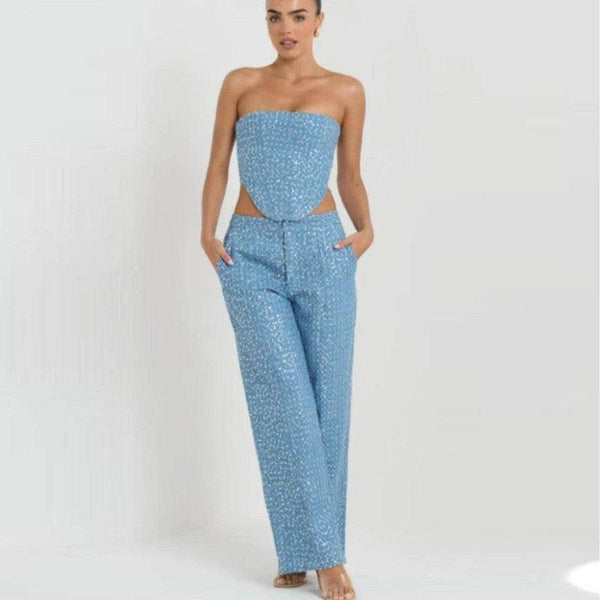 - Тип изделия: Джинсовый топ с блестками и брючный костюм с широкими штанинами