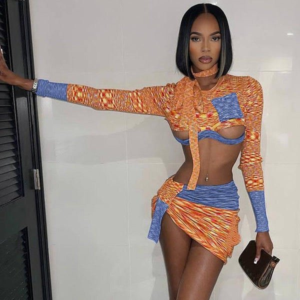 Вязаный топ с длинными рукавами и кроп-топ Тонкий юбочный костюм