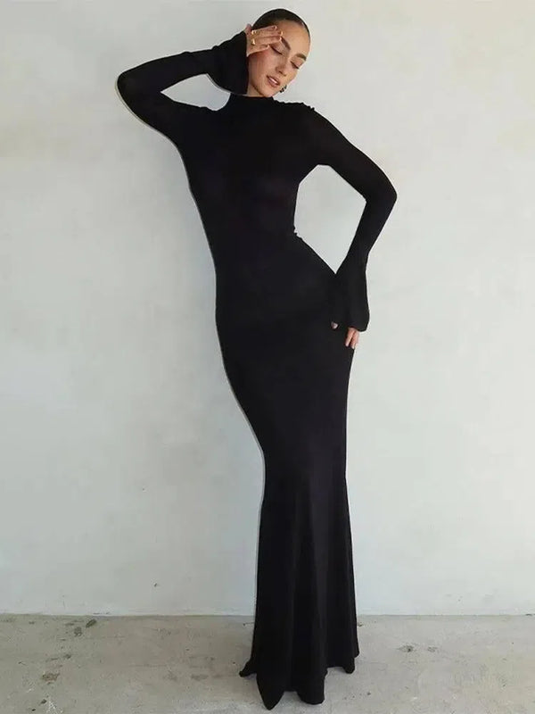 Однотонное платье макси с открытой спиной – Вечерняя одежда с рукавами-трубами