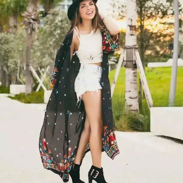 - Тип одежды: Длинный кардиган-кимоно с открытым передом, подходящий к нему топ и джинсовые шорты с высокой талией .