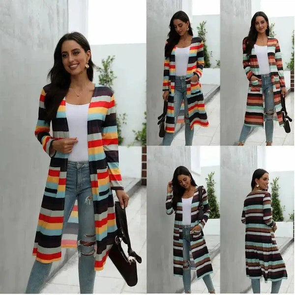 Полосатый длинный свитер-кардиган для женщин