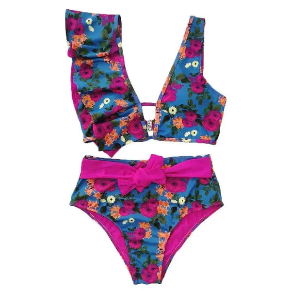 - Тип изделия: Асимметричный купальник-бикини с оборками и высокой талией