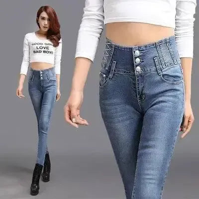 новая высокая талия пряжка стрейч джинсы женские корейские