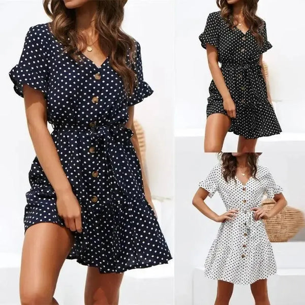 Повседневное шифоновое женское платье в горошек с высоким ремнем и V-образным вырезом