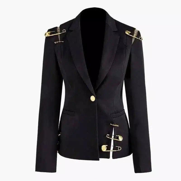 - Стиль выреза/плеч: зазубренный лацкан с декоративными деталями на плечах