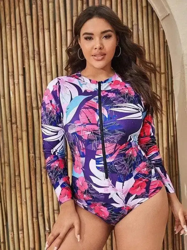 Женский цельный купальник размера плюс, с длинными рукавами и принтом