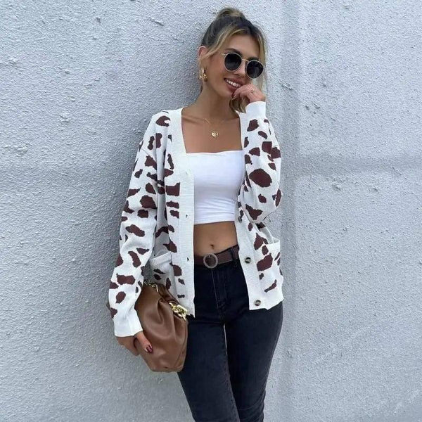 Вязаное пальто-свитер с леопардовым принтом и V-образным вырезом