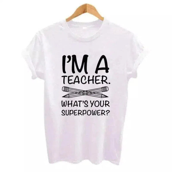 - Особенности дизайна: На лицевой стороне жирный типографский принт с фразой "I'M A TEACHER. WHAT'S YOUR SUPERPOWER?", сопровождаемая графическим изображением двух скрещенных карандашей под текстом.