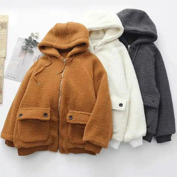 Свободная теплая куртка из меха ягненка с капюшоном