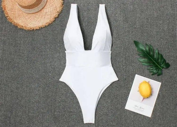 Цельные модели с V-образным вырезом, облегающей спиной и высокой талией
