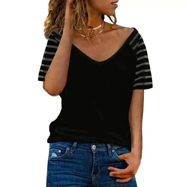 Женская футболка с полосатым рукавом и V-образным вырезом