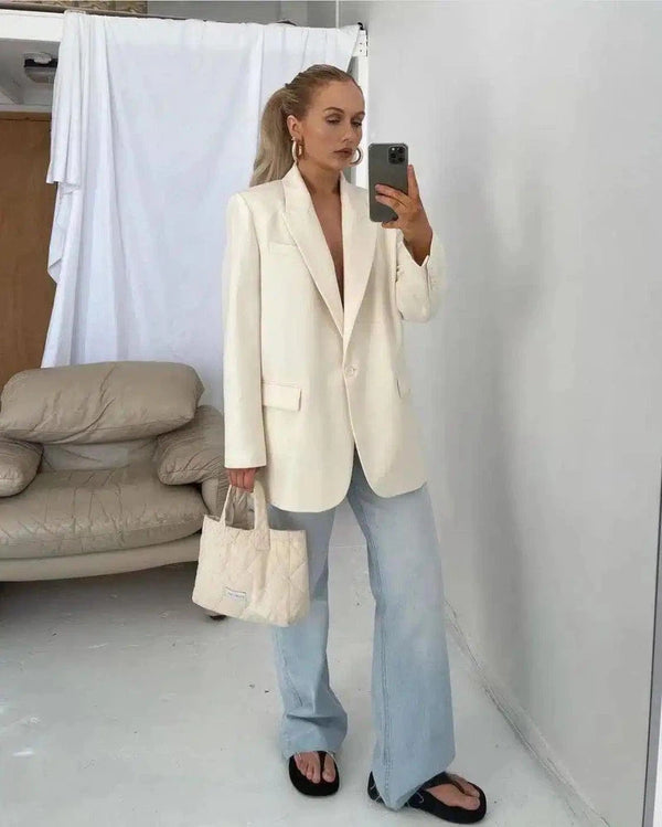Женский приталенный блейзер и джинсы с широкими штанинами