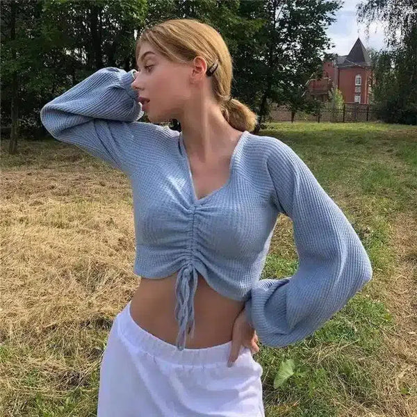 Светло-голубой кроп-топ с рюшами - модно и удобно