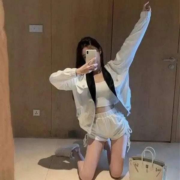- Облегание или эластичность: Шорты с регулируемой талией на шнурке; жакет свободного покроя