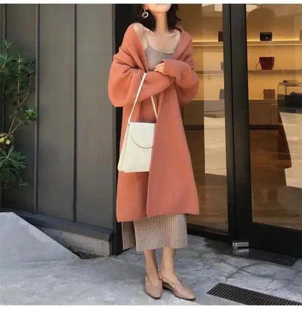 Теплое длинное пальто и вязаное платье женская мода комбо
