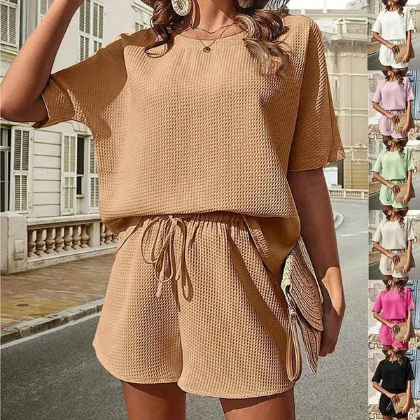 Новый вафельный костюм женский летучая мышь с коротким рукавом с вырезом экипажа топ и стринги дизайн шорты мода две части набор летняя одежда