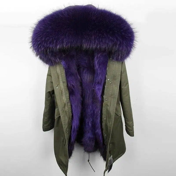 - Воротник: Роскошный негабаритный мех енота