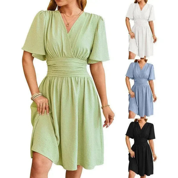 V-образным вырезом с короткими рукавами платье Мода колокол с рукавами платье лето женская одежда
